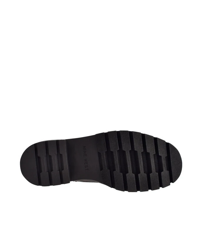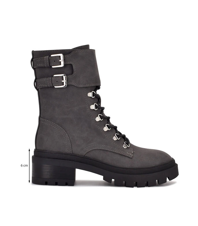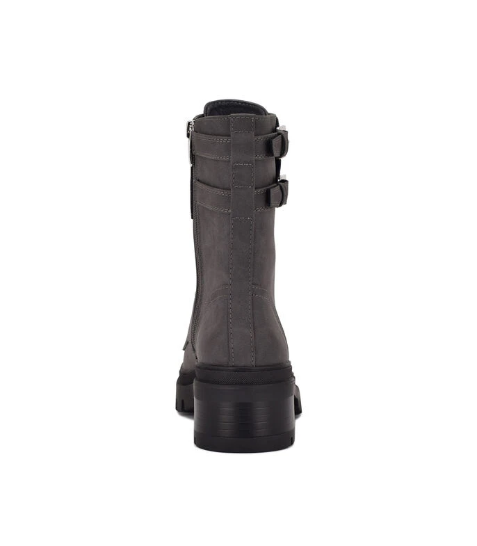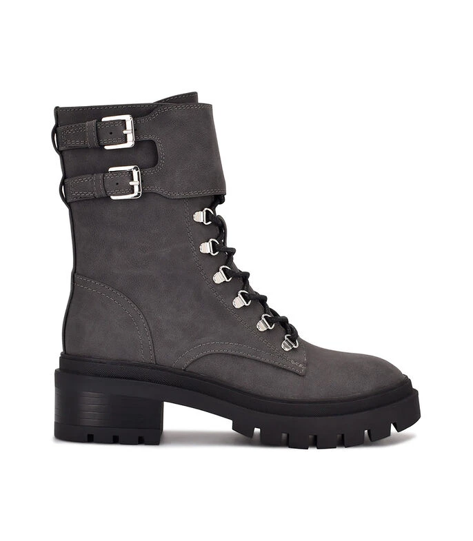 Bota Nine West Halima con tacón medio ancho; elaborada en material sintético color gris con fijación de agujeta, punta redondeada, cierre lateral, detalle de hebillas en borde superior y suela antiderrapante.