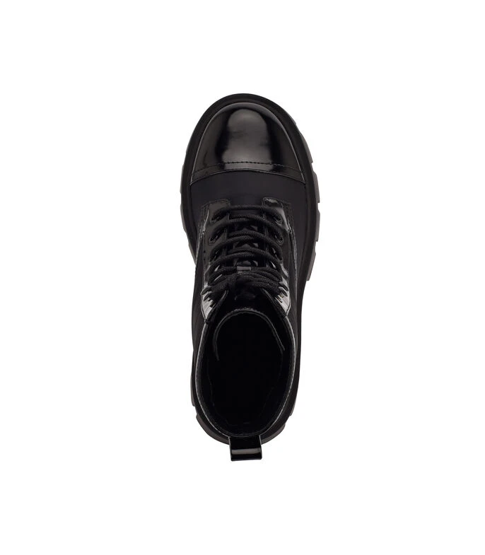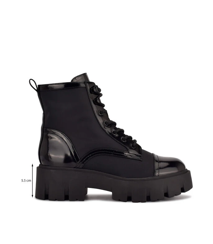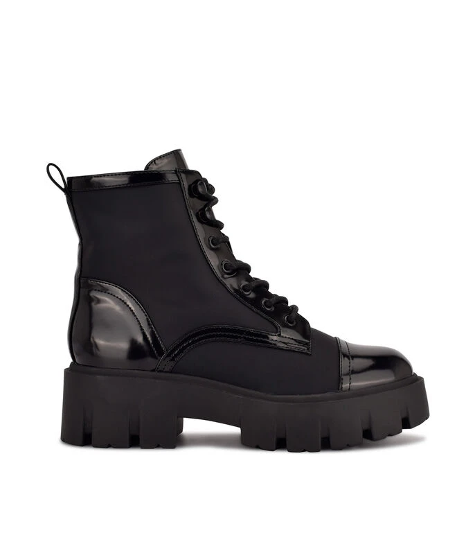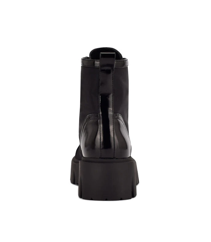 Bota Nine West Nobri con tacón medio ancho; elaborada en textil color negro con fijación de agujeta, punta redondeada y suela antiderrapante.