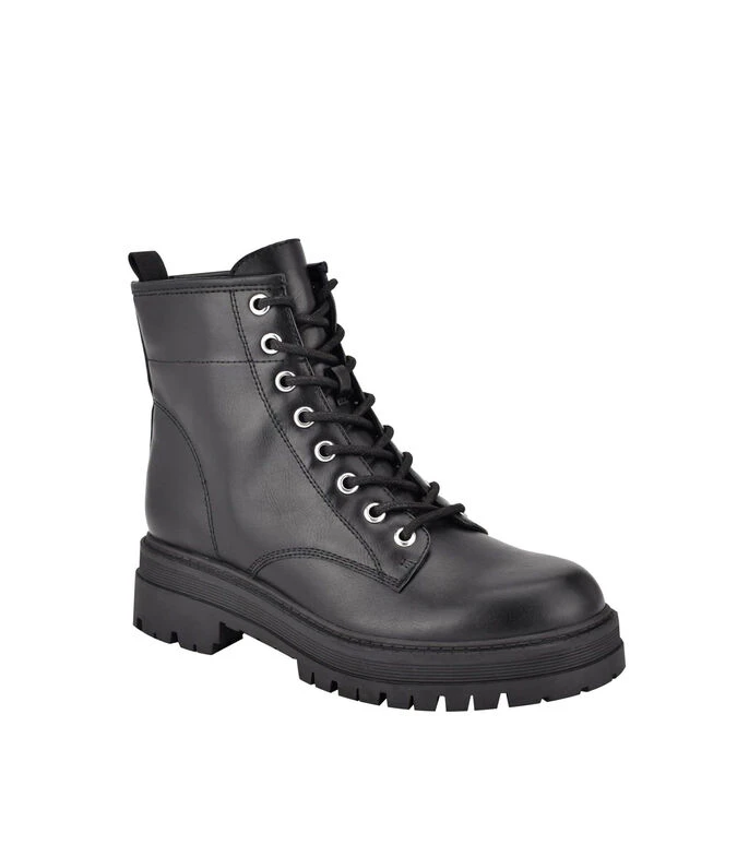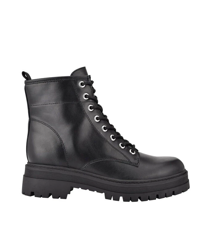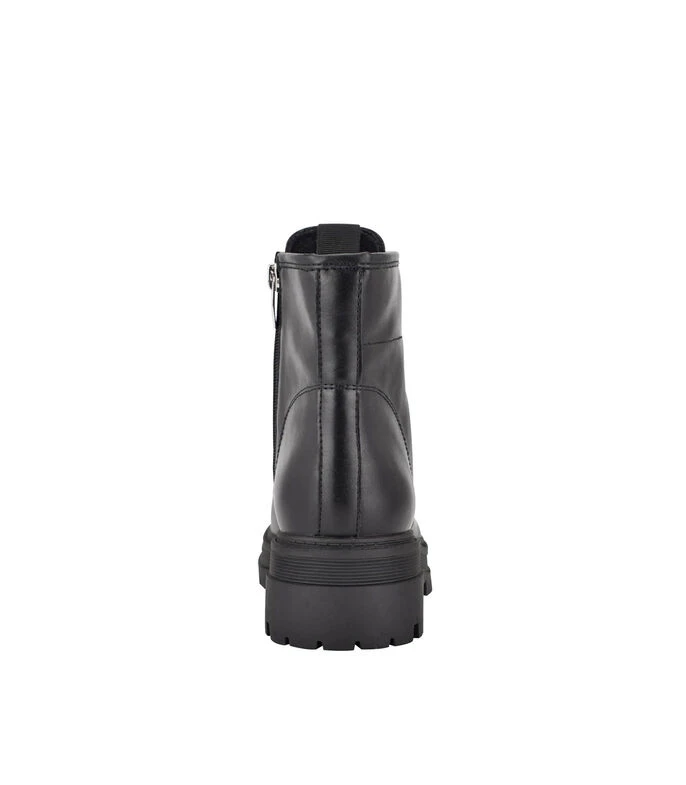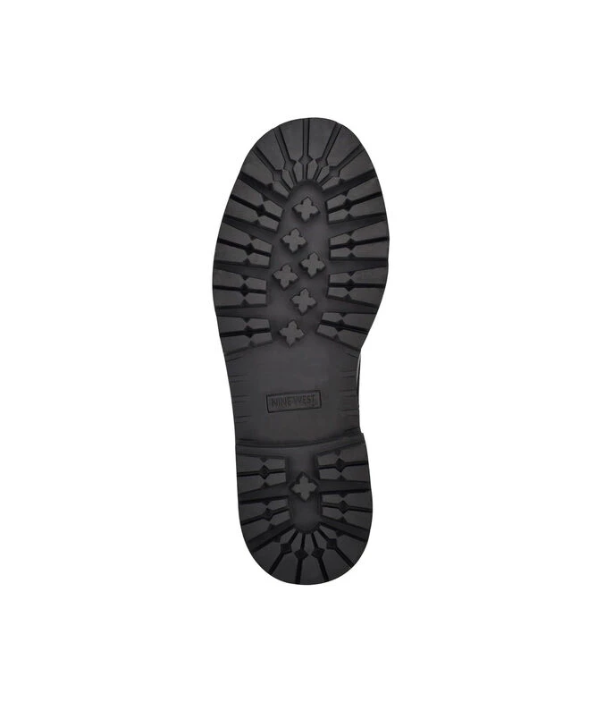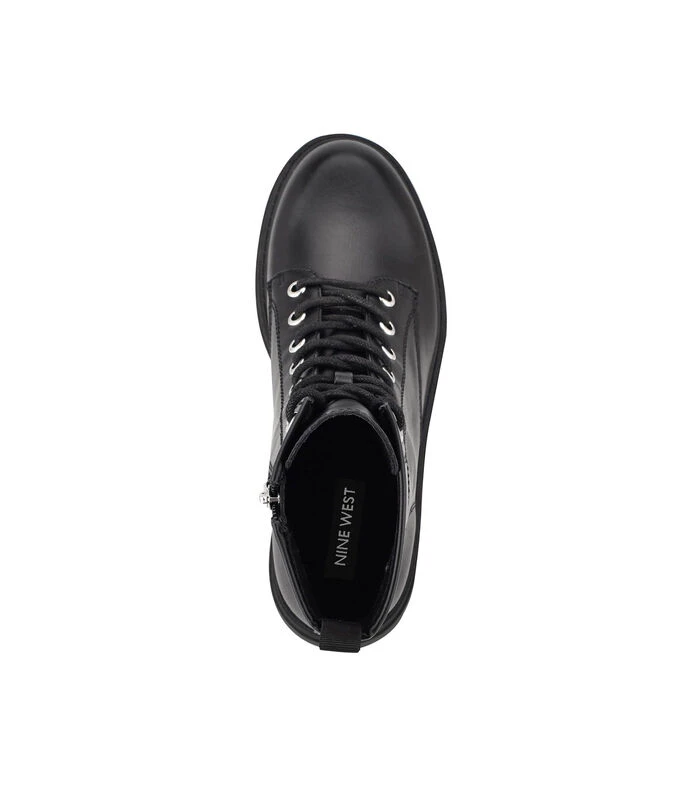 Botín Nine West con tacón bajo elaborado en material sintético color negro, punta redondeada, agujeta sobre empeine, cierre en lateral y suela a tono.