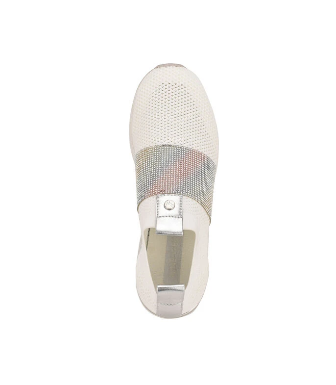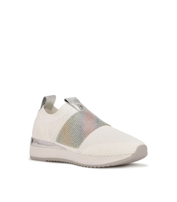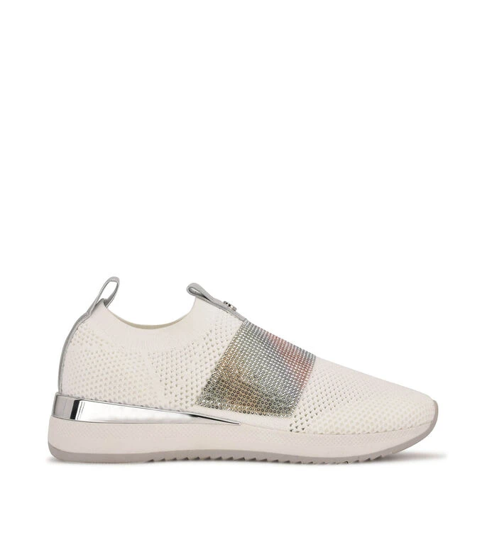 Tenis Nine West casual elaborado en material textil con aplicación de estoperoles, fijación elástica, punta redonda y suela antiderrapante.