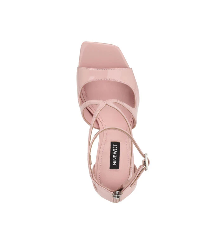 Zapatilla Nine West con tacón alto de aguja elaborada en material sintético rosa, acabado tipo charol, tiras en empeine, punta cuadrada y cierre de pulsera ajustable.