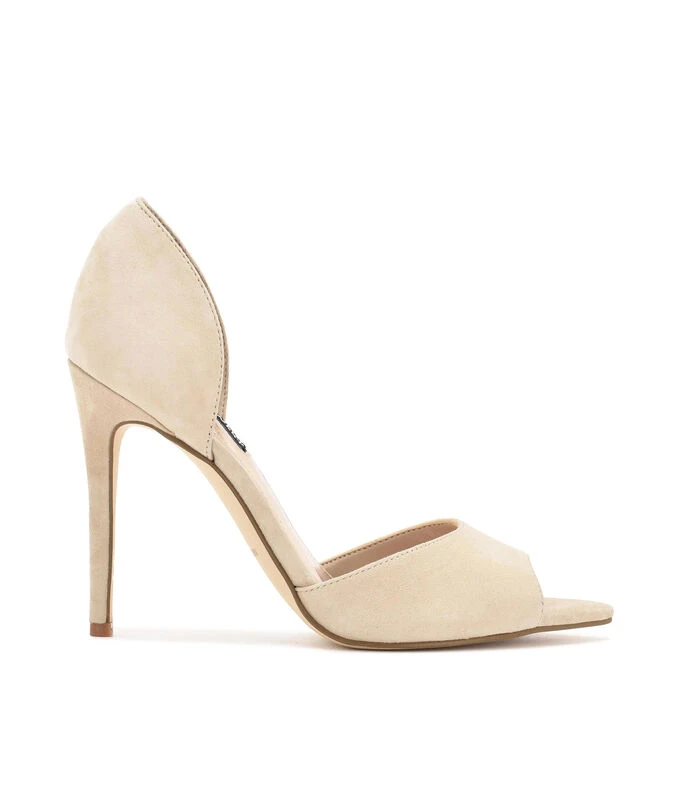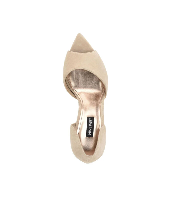 Zapatilla Nine West de tacón alto de aguja elaborado en piel de color beige con diseño liso, punta afilada y empeine con textura lisa.