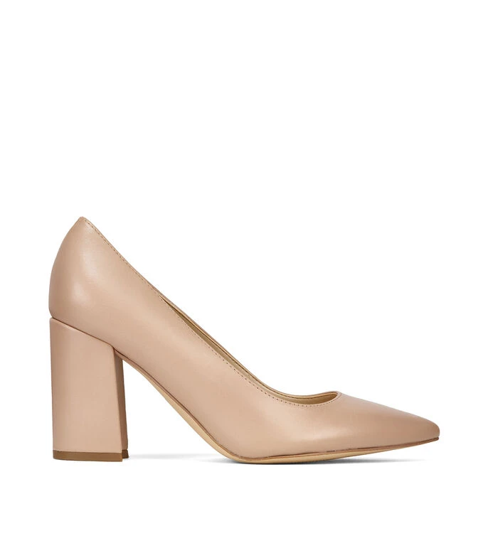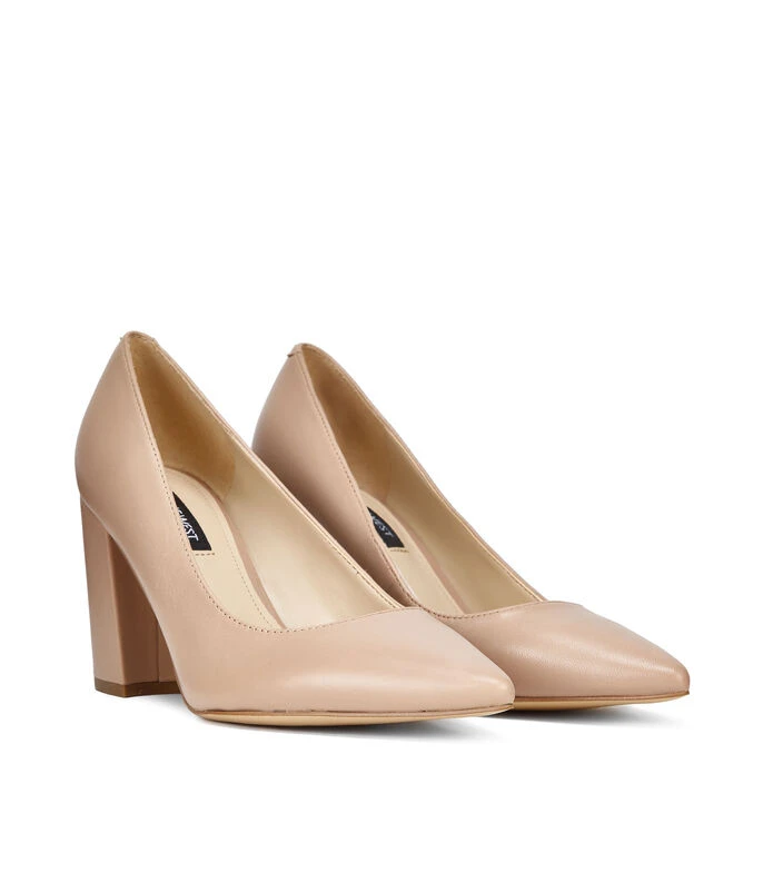 Zapatilla Nine West de tacón alto ancho elaborada en piel de color beige con diseño liso, punta afilada, empeine a tono y suela a contraste.