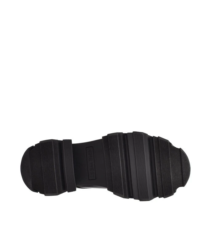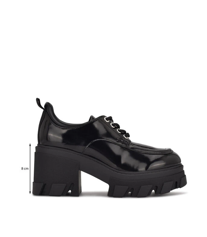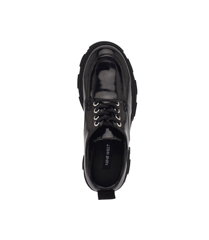 Zapato Nine West elaborado en material sintético de color negro con diseño liso, punta redonda, fijación de agujeta, empeine con textura lisa y suela a tono.