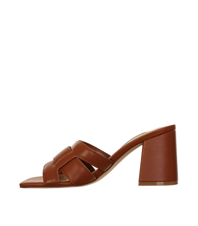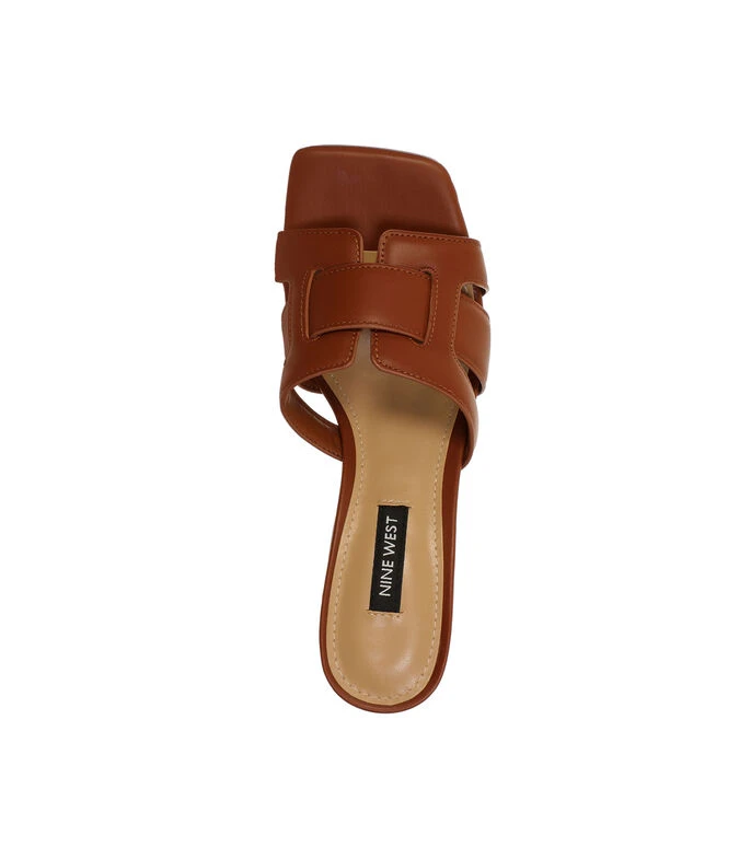 Zueco Nine West con tacón medio de meda luna, elaborado en material sintético color café con textura lisa, punta cuadrada, cintas cruzadas en empeine, talón descubierto y suela antiderrapante.