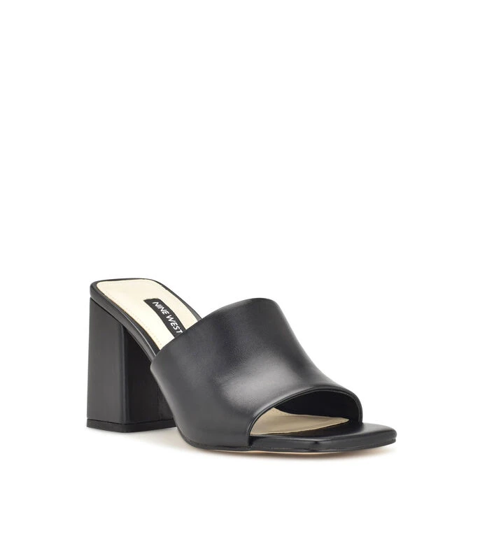 Zueco Nine West, elaborado en material sintético color negro, con punta cuadrada, banda en empeine, tacón medio ancho y estilo slip on.